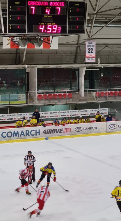 Początek tercji trzeciej to 5 minut wzajemnego rozgrywania. W 45:14 Zubek, Sroka i Maksimenko zdołali wyjść jednak ze wspólną akcją, w której punktował Zubek. 15 minut do końca i wynik 4:7 nastrajał pozytywnie, ale Cracovia nie powiedziała jeszcze ostatniego słowa. Od 46 minuty rozpoczęła ostrą pogoń za wynikiem. W efekcie gracze Cracovii wyrównali i… czekała nas dogrywka. Tam na szczęście naszego zespołu wystarczyło 51 sekund, by padło rozstrzygnięcie. Patryk Zubek i Marcin Sroka wyprowadzili akcję, która dała nam wygraną. Strzelił Sroka.