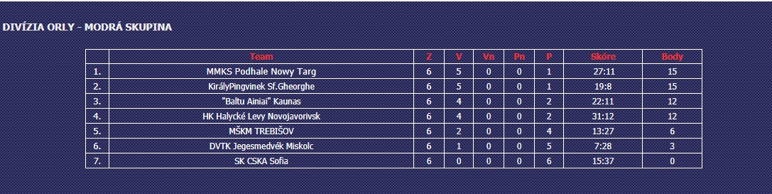 Po pierwszej rundzie w klasyfikacji Dywizji Orłów (Grupa Niebieska) na pierwszym miejscu w tabeli plasują się zawodnicy grający pod sztandarem MMKS Podhale Nowy Targ. Przed nimi jednak nieławe wyzwanie, bo na pierwsze miejsce w tabeli ostrzą kły m.in. zawodnicy KirályPingvinek Sf.Gheorghe, którzy z taką samą ilością punktów na koncie, zajmują obecnie drugie miejsce.