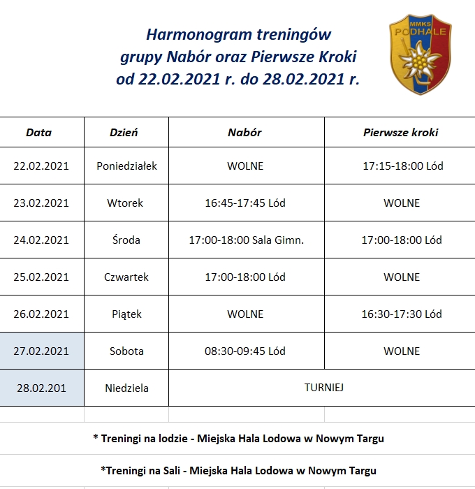 Poniżej prezentujemy harmonogram treningowy dla dzieci z grupy Naboru oraz uczestniczących w zajęciach Pierwszych Kroków. Harmonogram przewidziany jest na okres od 22.2.2021 r. do 28.02.2021.