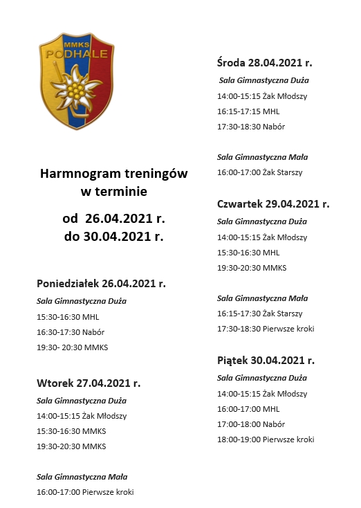 Zachęcamy do zapoznania się z harmonogramem treningów dla grup: MHL, Żak Młodszy i Żak Starszy. Harmonogram przewidziany jest na okres od 26.4.2021 r. do 30.04.2021.